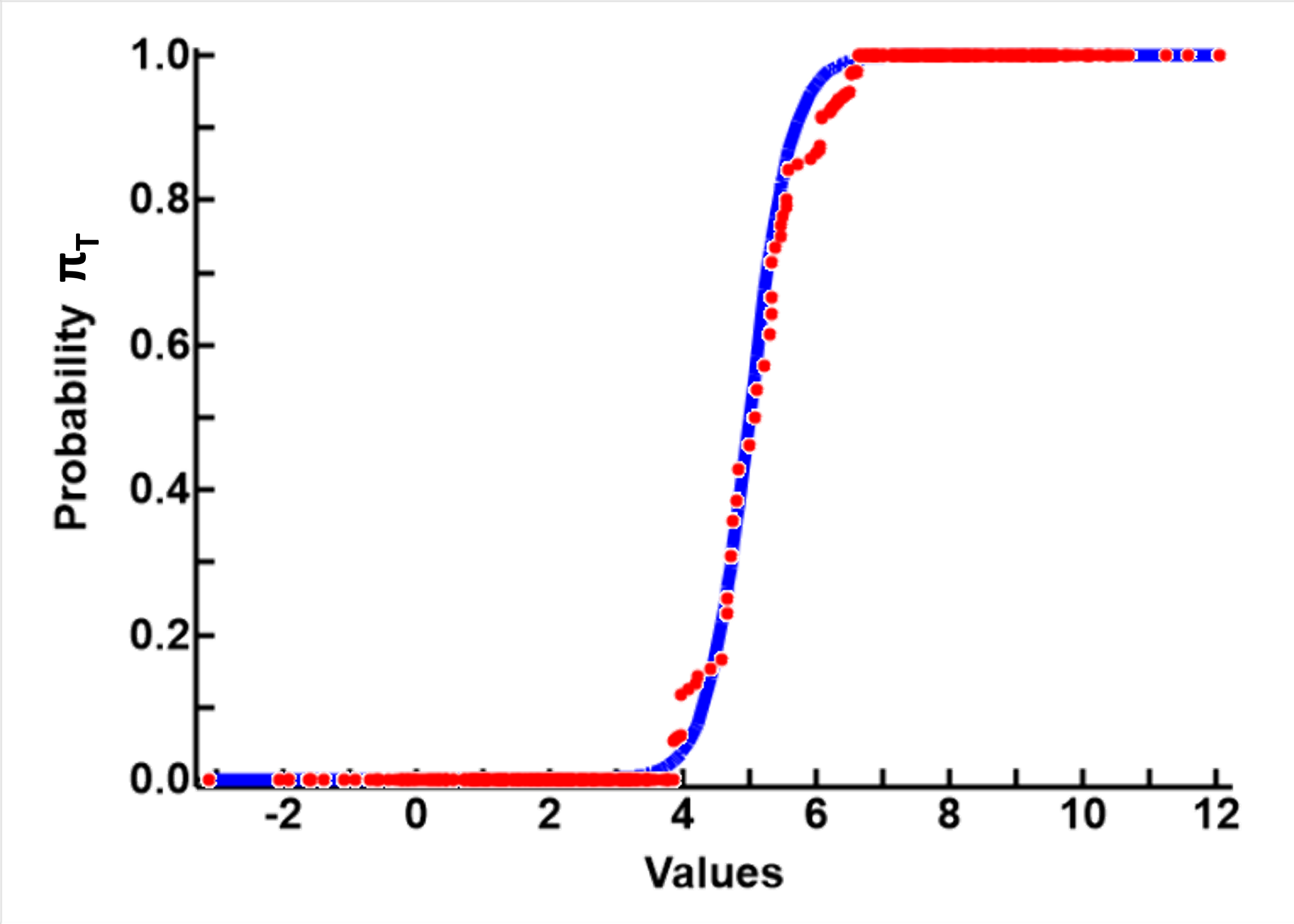 The theoretical relationship between value v and probability of being in group T πT is shown by the blue line. This line is calculated based on the parameters that the two means are μT=2 and μT=8, and both groups have the same SD σ=1.5