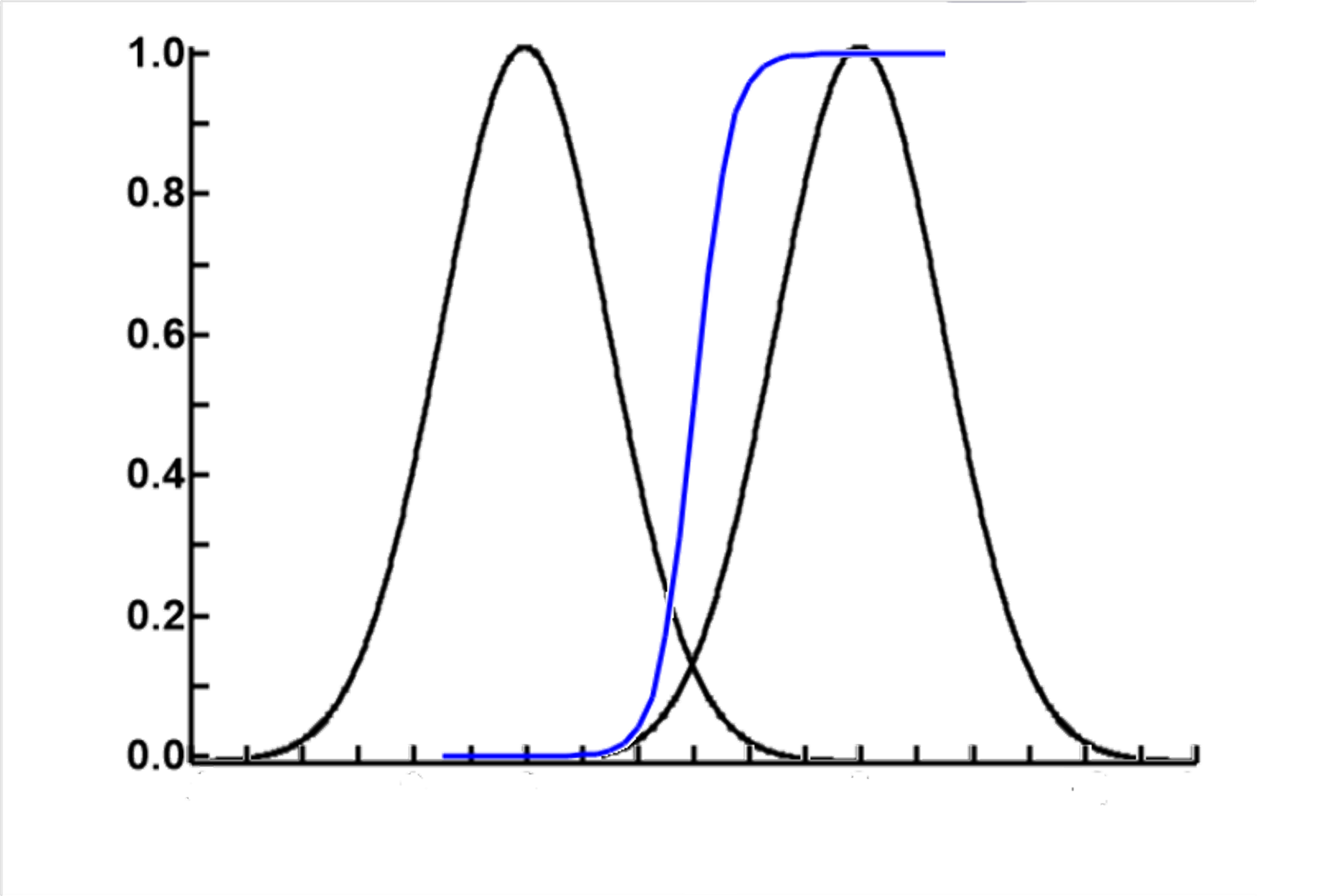 The results of these calculations are as shown in the blue line in the plot to the left. Please note that the vertical axis is scaled to probability and not to the height of the two normal distributions. The 2 normal distribution curves are there to show the relationship between probability and the horizontal values