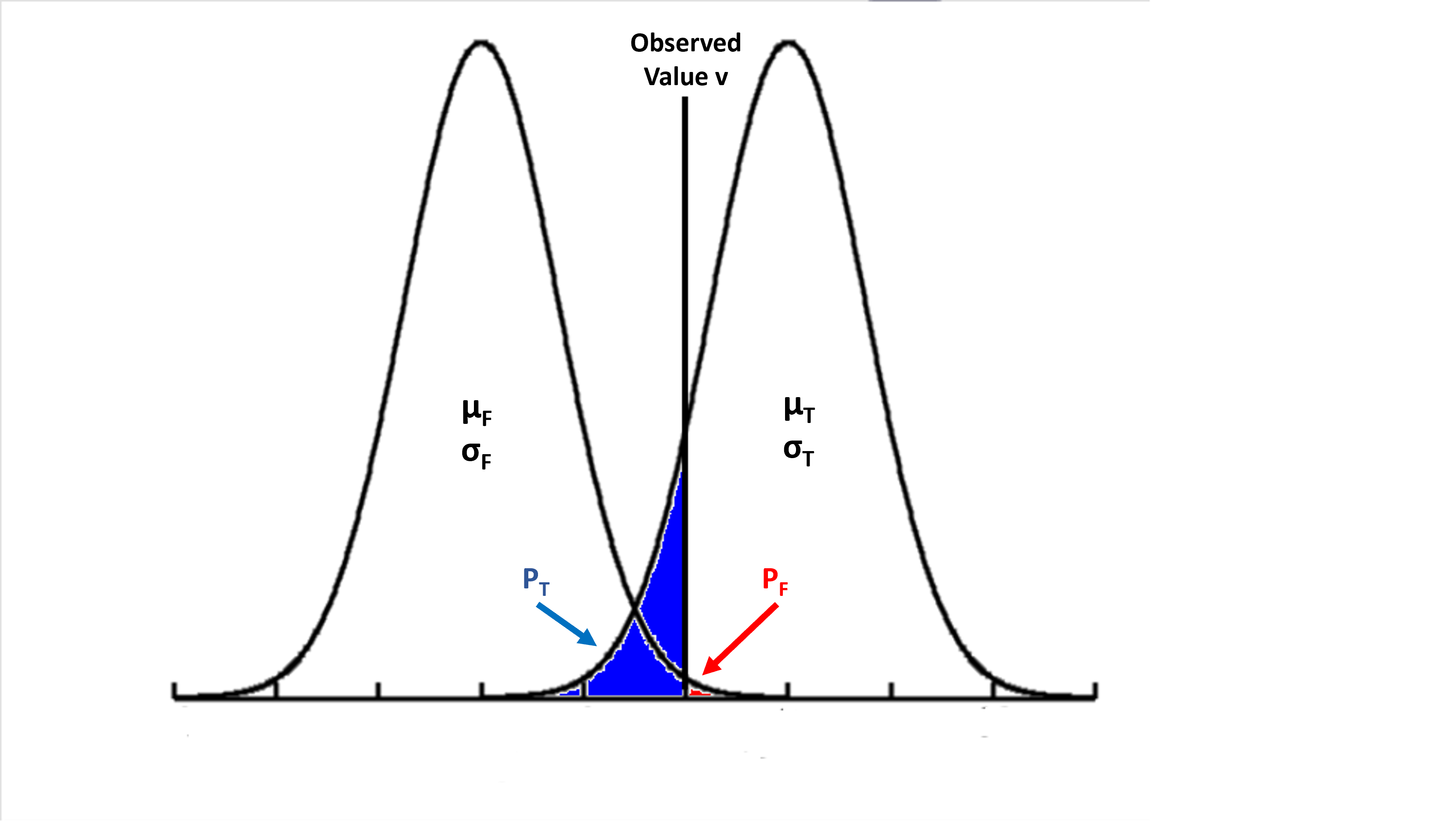 The blue area is the proportion of group T defined by the value v (PT)