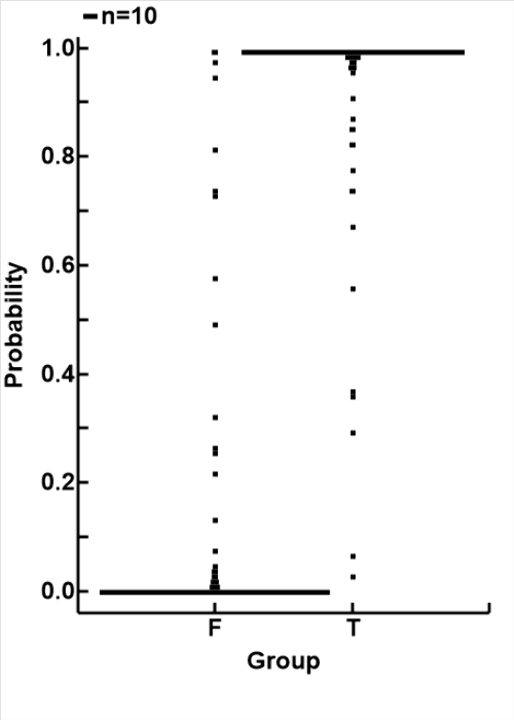 This can be demonstrated in the plot to the right, using the same testing data. The algorithm compresses all non-overlapping values to 0 and 1, and the overlapping values as probabilities of belonging to group T (πT)